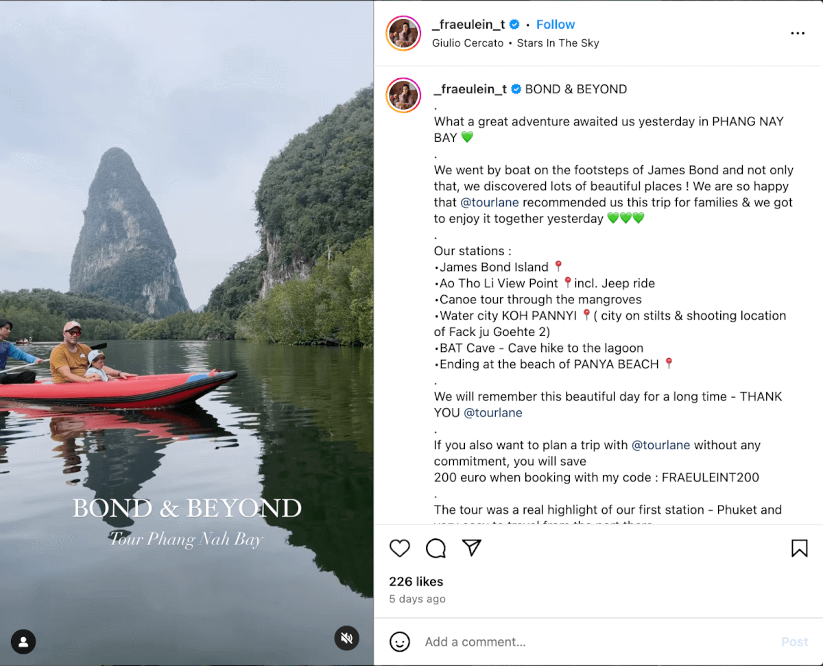 A Tourlane planeia múltiplos conteúdos com os influencers antes de começarem a viagem. Um exemplo é a colaboração com a influencer de viagens Louisa Thomas, que publicou várias vezes enquanto viajava pela Tailândia.