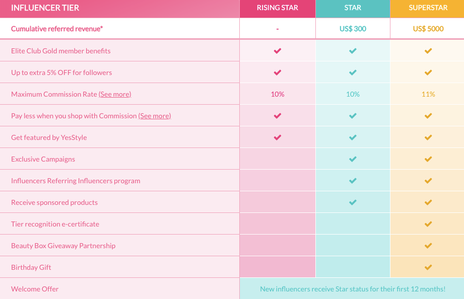 Embaixadores de nível superior também são incluídos no programa Influencers Referring Influencers, que lhes permite ganhar uma parte de qualquer venda gerada pelos embaixadores que indicarem. É uma jogada inteligente, ajudando a YesStyle a recrutar novos embaixadores com quase nenhum esforço de sua parte.