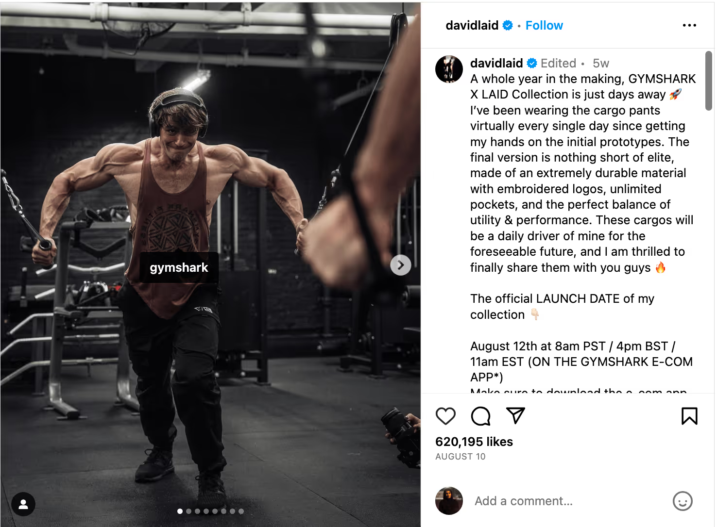 Os atletas Gymshark recebem novos produtos antes do lançamento oficial, convites para eventos exclusivos e códigos de desconto personalizados para compartilhar com seus seguidores. David Laid é um embaixador de longa data da Gymshark e lançou recentemente sua própria linha com a marca. Aqui está o anúncio: