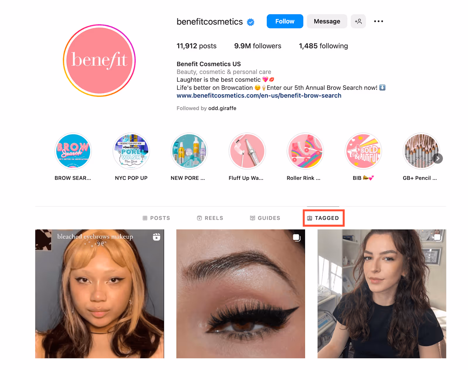 Como monitorizar os posts ou stories em que a sua marca é tagada? O Instagram envia notificações; pode também ir ao seu perfil e clicar no botão “Tagado” para verificar o conteúdo em que foi tagado.