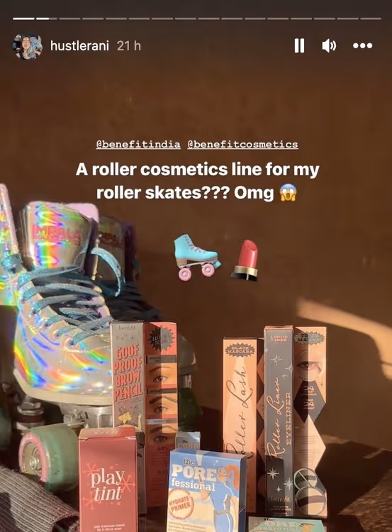 Este método também se aplica se fez uma campanha de distribuição de produtos ou se ofereceu presentes a influencers. Verifique se o criador de conteúdo do Instagram que recebeu o produto ou presente publicou sobre a sua marca nas suas Stories ou Reels. Por exemplo, a Benefit Cosmetics ofereceu os seus produtos à influencer do Instagram Ankita Chawla, e ela publicou sobre isso nas suas Stories.