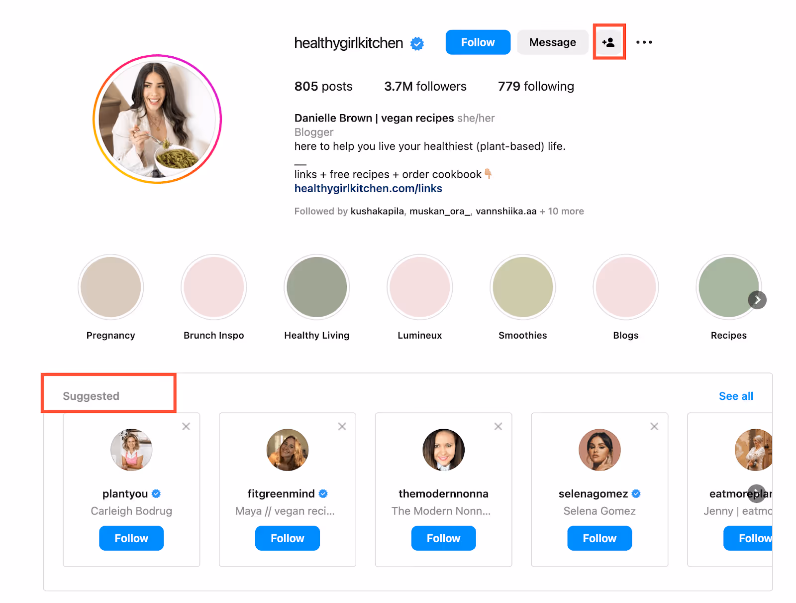 Também pode fazer isto no Instagram usando o botão ao lado da opção de mensagem, e a plataforma irá sugerir contas semelhantes.