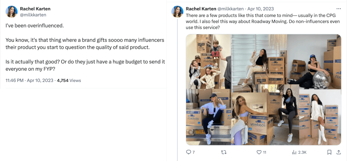 Mas, na realidade, os consumidores podem ficar incomodados e começar a questionar a tua autenticidade se enviares repetidamente os teus produtos a todos os criadores do feed deles. Exemplo disso: Rachel Karten diz que foi inundada com tanto conteúdo de influencers da Roadway Moving que começou a perguntar-se se pessoas comuns sequer usam o serviço deles.
