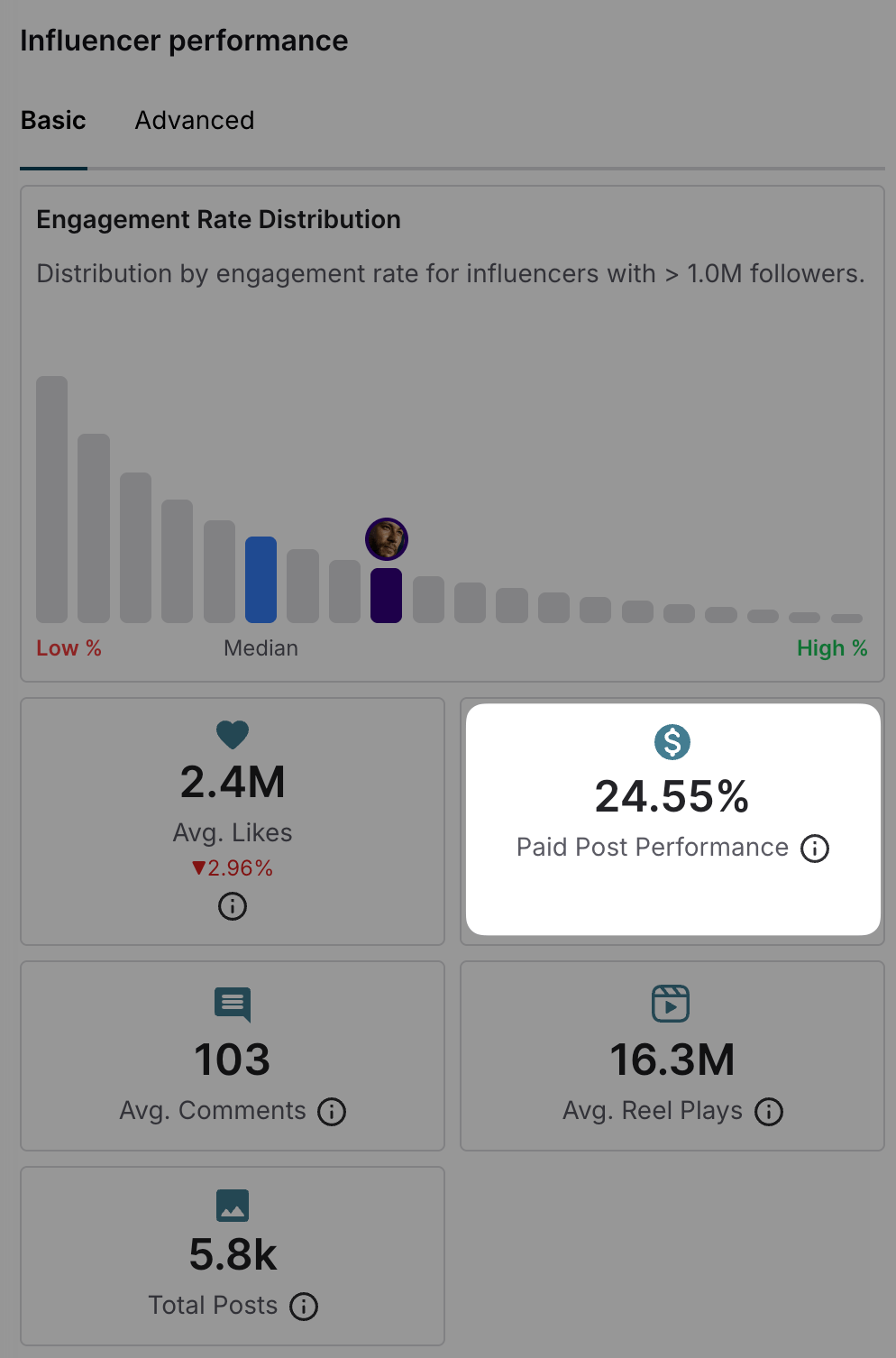 E não se preocupe: você não precisa filtrar manualmente o conteúdo patrocinado da página do influenciador nem calcular a mediana/média de visualizações. Você pode evitar essa dor de cabeça facilmente com o Modash. Ela compara as curtidas de publicações pagas com as de publicações patrocinadas.