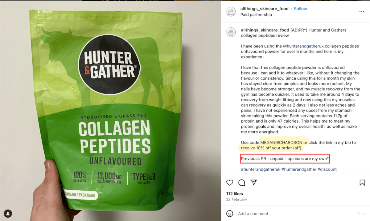 - Ou, se uma empresa deseja gerar conhecimento sobre um produto específico, a Augmentum Media mantém esse produto no centro e encontra influenciadores cujo público possa achá-lo útil. Por exemplo, os principais parceiros influenciadores da Hunter & Gather podem ser criadores do nicho de "saúde". Mas, como seu pó de colágeno é um ingrediente chave para uma pele excelente, eles também presenteiam muitos influenciadores de skincare — um ótimo exemplo de encontrar criadores em nichos adjacentes para diversificar e renovar seu conteúdo de influenciadores.