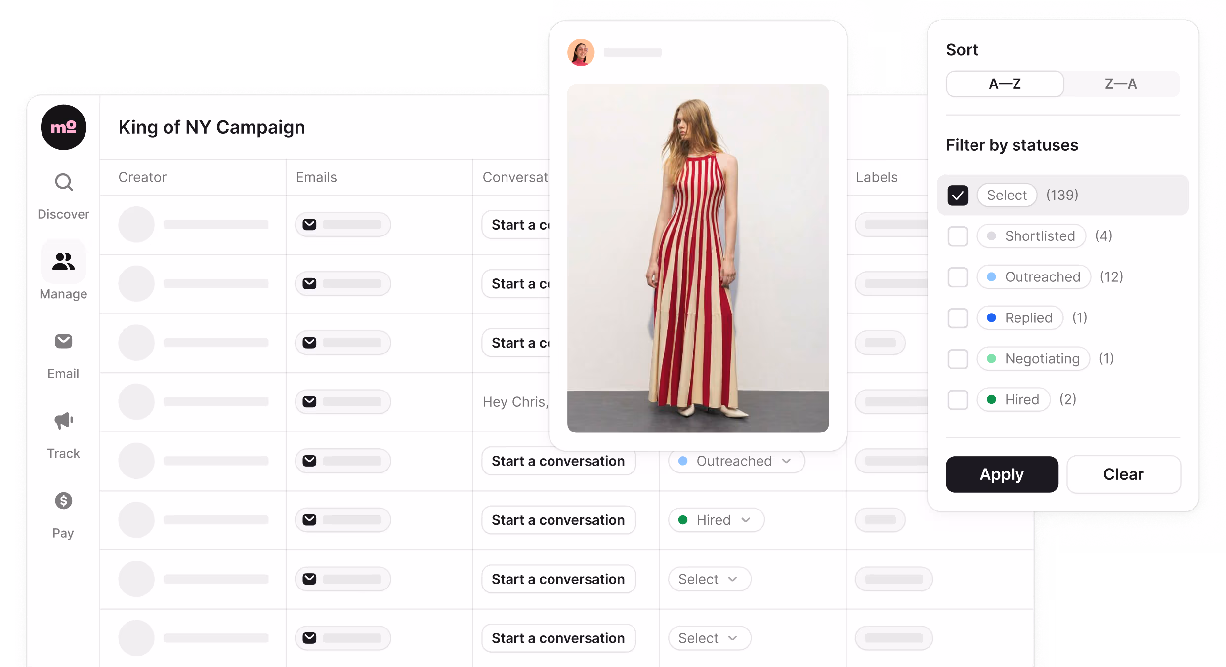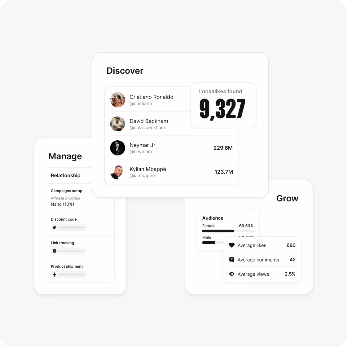 - Influencer performance (Follower count, Average likes, Engagement rate, Past Paid Post Performance)