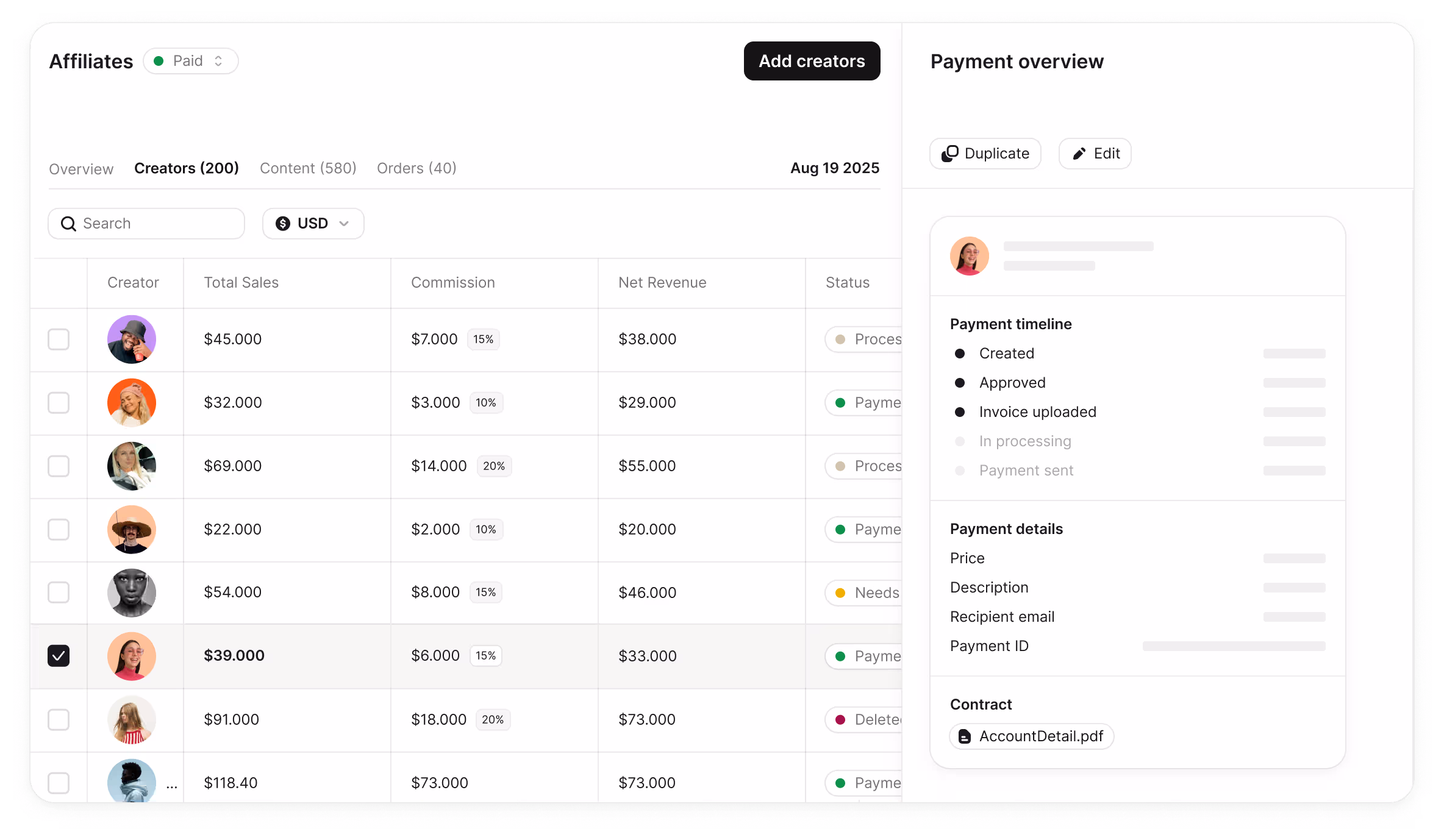 Keep every creator relationship in one place, with conversations, gifts, contracts, performance tracking, and affiliate statuses.